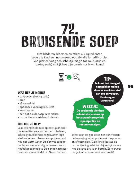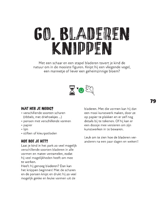 ‘Als ik naar buiten trek met mijn zoontjes Louiz (6) en Nowa (2), koppel ik onze uitstap vaak aan een activiteit’, vertelt Elke. ‘Dat kan gaan van een kabouterdorp bouwen tot stempelen met bladeren. In mijn boek heb ik 100 ideeën verzameld die ik zelf heb bedacht. Ik ben opgegroeid in een doodlopende straat en was heel vaak buiten te vinden. Ik ben dus vertrokken van spelletjes die ik als kind zelf speelde en zaken die ik knutselde. Doorgaans hebben mijn zoontjes trouwens niet meer nodig dan een aanzet. Ik leg het concept uit en zij laten zich zo meeslepen door hun fantasie, dat ze er een nog veel groter spel van maken en uren zoet zijn.’